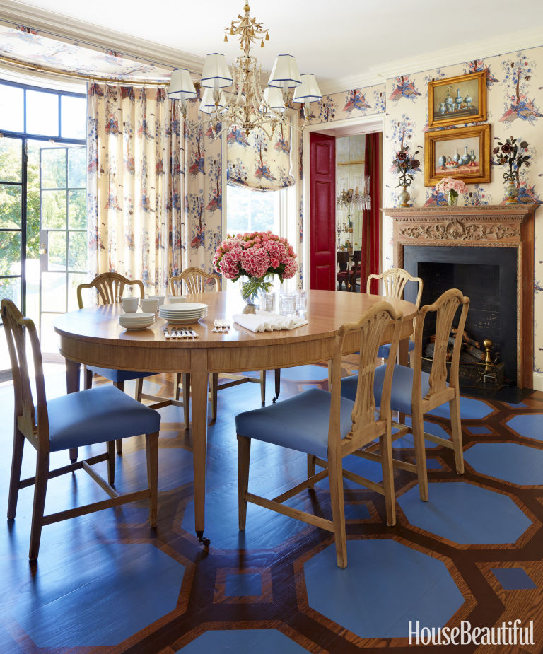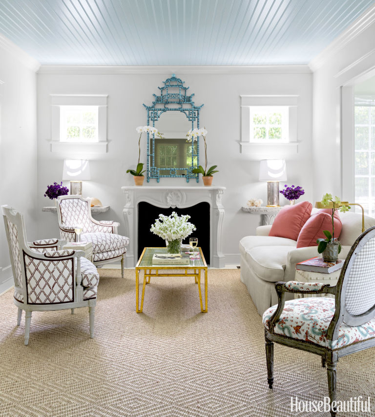 Ah, that's the trick. People think decorating is about picking out pretty things and scattering them around, but it's the floor plan that's paramount. I'm obsessed with traffic flow. For example, you have to walk through the living room to get to the dining room, so I used bergères on one side of the fireplace — instead of another sofa — because chairs are easier to navigate. Next, I lay out color and pattern within the plan. The print on the seat of the living room fauteuil is the linchpin because you see every single color in the house: off-white, brown, coral, turquoise. It's an extremely charming French print — very playful, like this whole house.